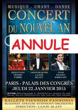 La production du spectacle LES VALSES DE VIENNE nous informe que la tournée des VALSES DE VIENNE 2015 est annulée et donc les 2 représentations prévues le 22 janvier prochain au Palais des Congrès de Paris n’auront pas lieu..."
